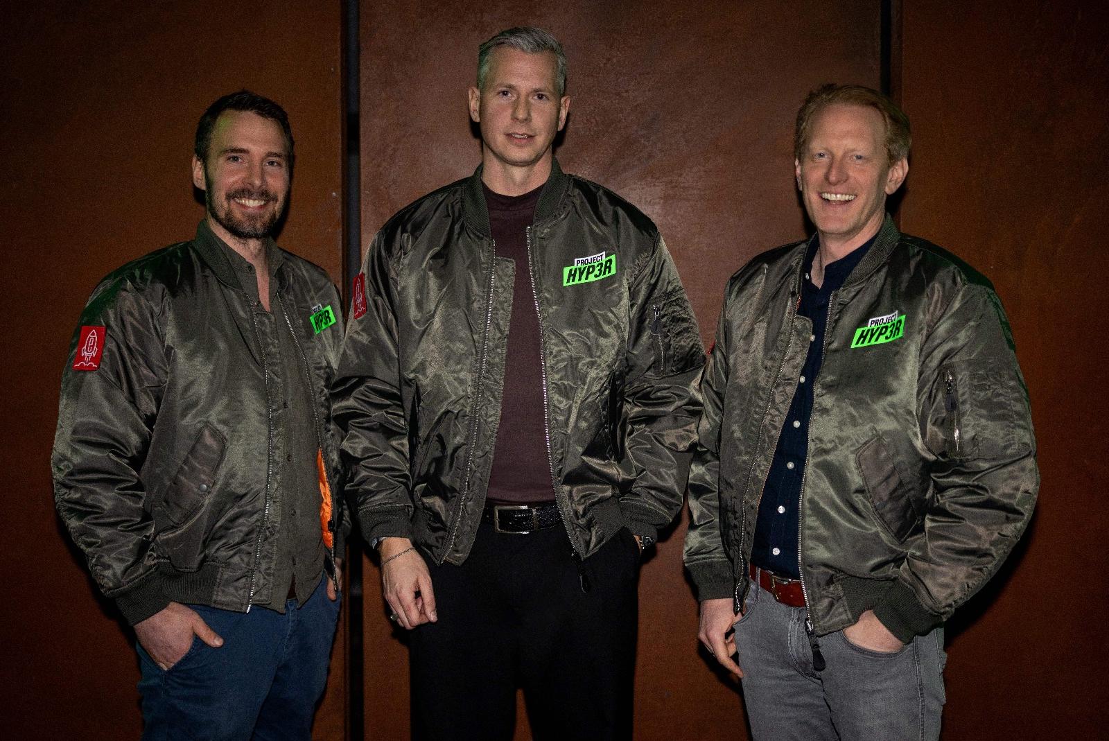 “Hyper 2030” heißt das neue Enova-Strategiekonzept. In Anlehnung an den Scooter-Hit “Hyper, Hyper” präsentiert sich die Spitze um Björn Burau (CFO), Hauke Brümmer (CEO) und Hendrik Böschen (COO) im Look der Techno-Band (von links). © Enova