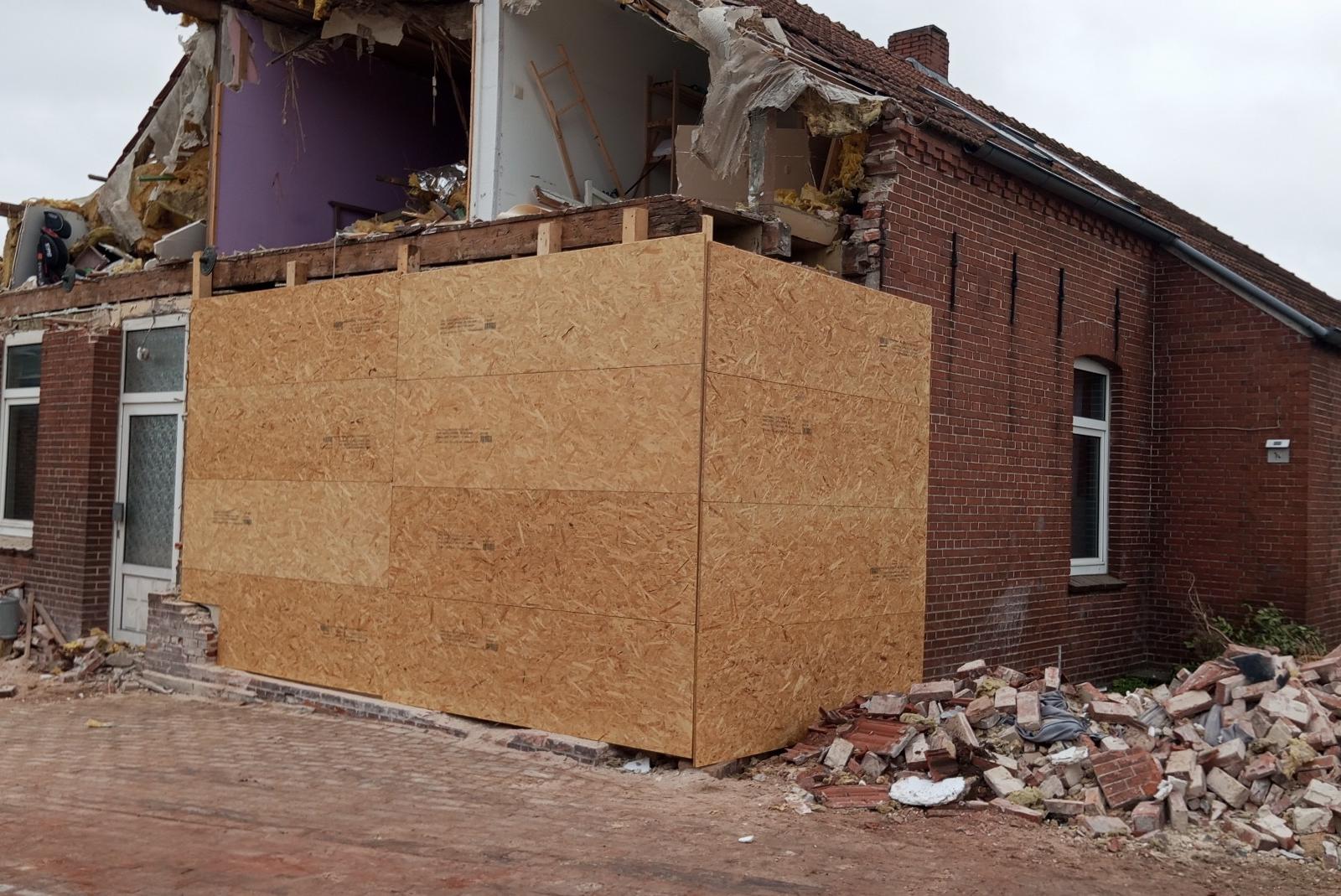 Nach dem Abtragen der losen Trümmerteile wurde der entstandene Bauschutt direkt auf einen Tieflader verladen und abtransportiert. Der Giebel des Gebäudes wurde neu abgestützt, um die restliche Substanz zu erhalten. Der beschädigte Mauerbereich wurde komplett verkleidet.