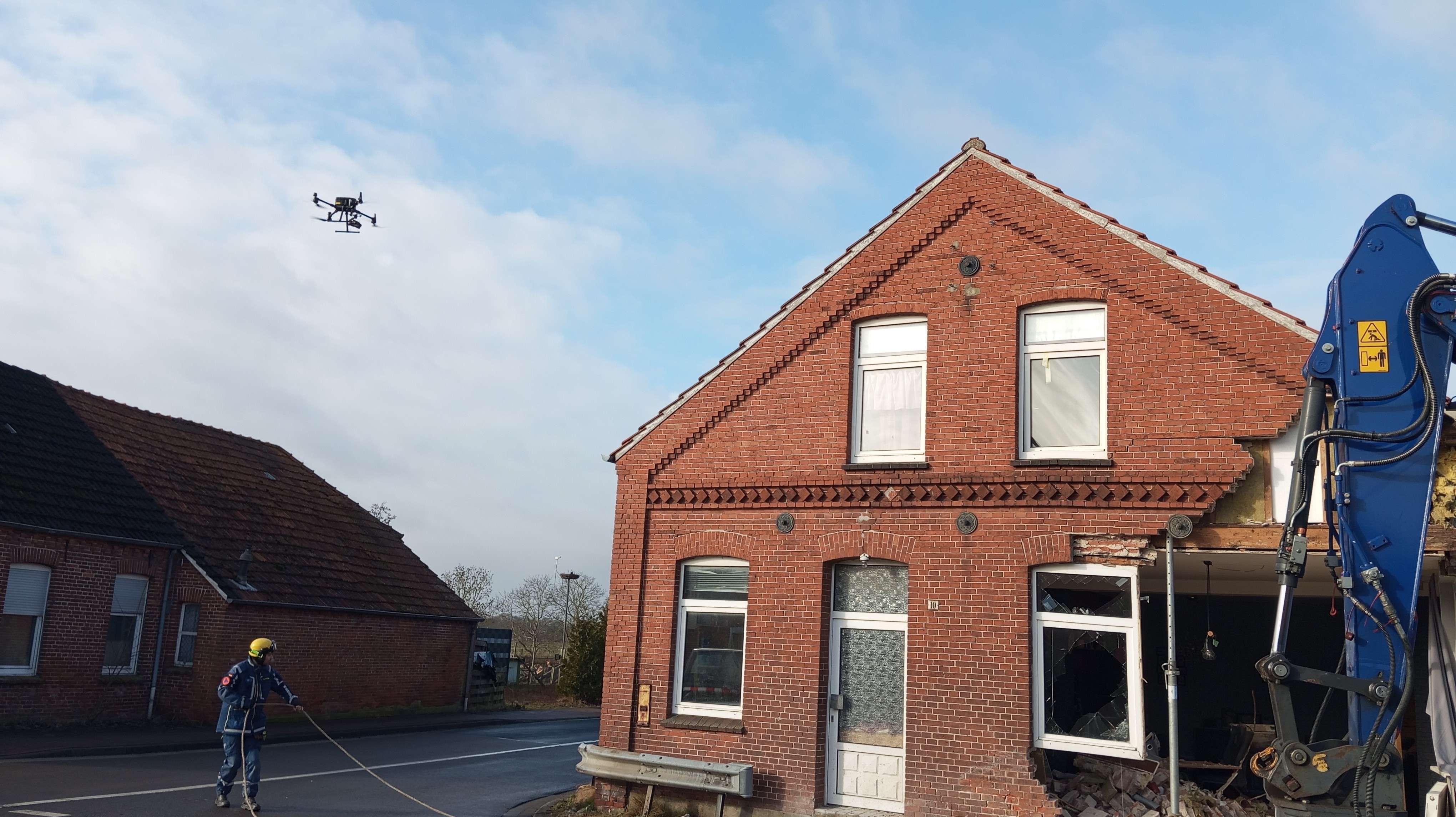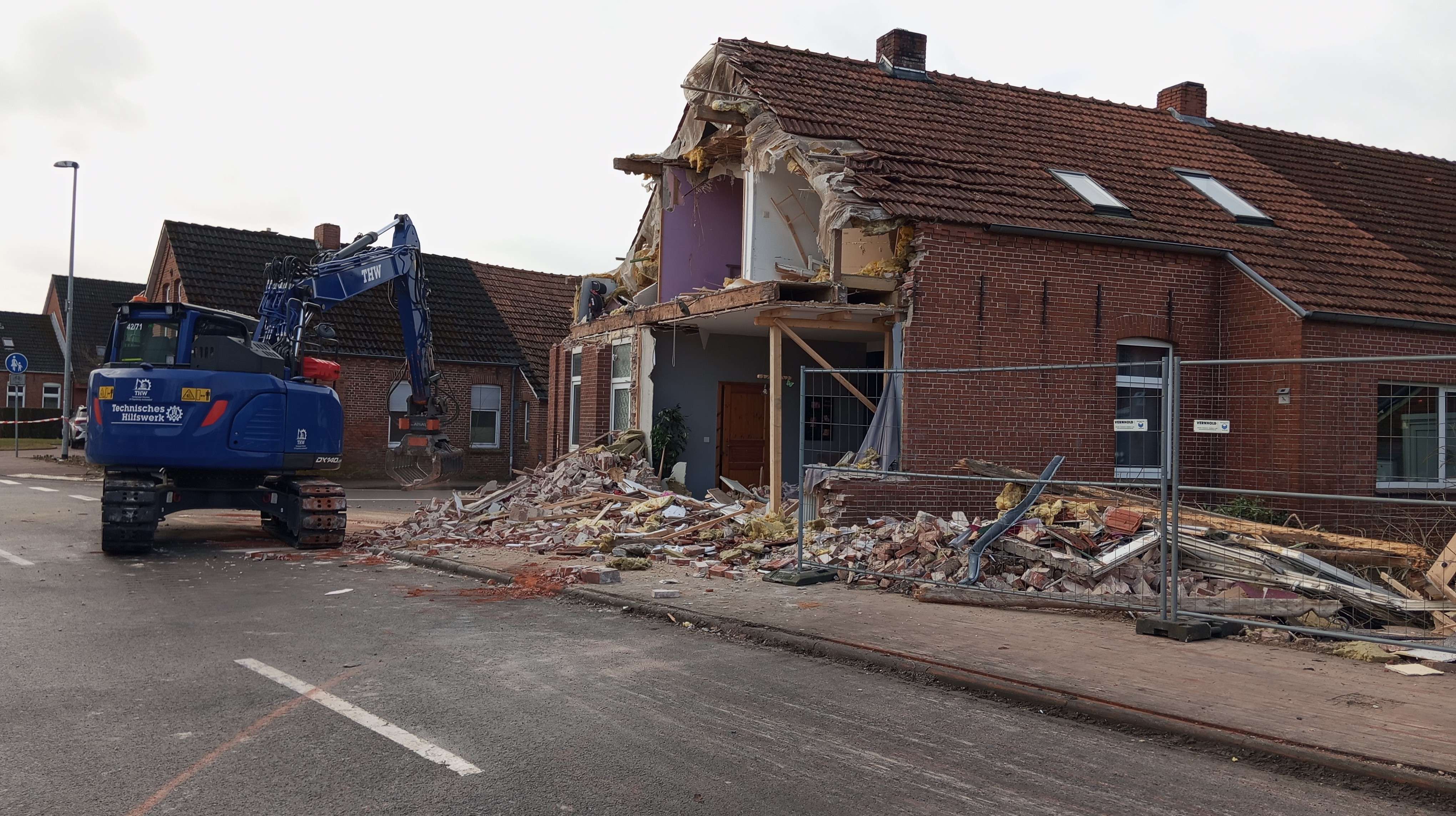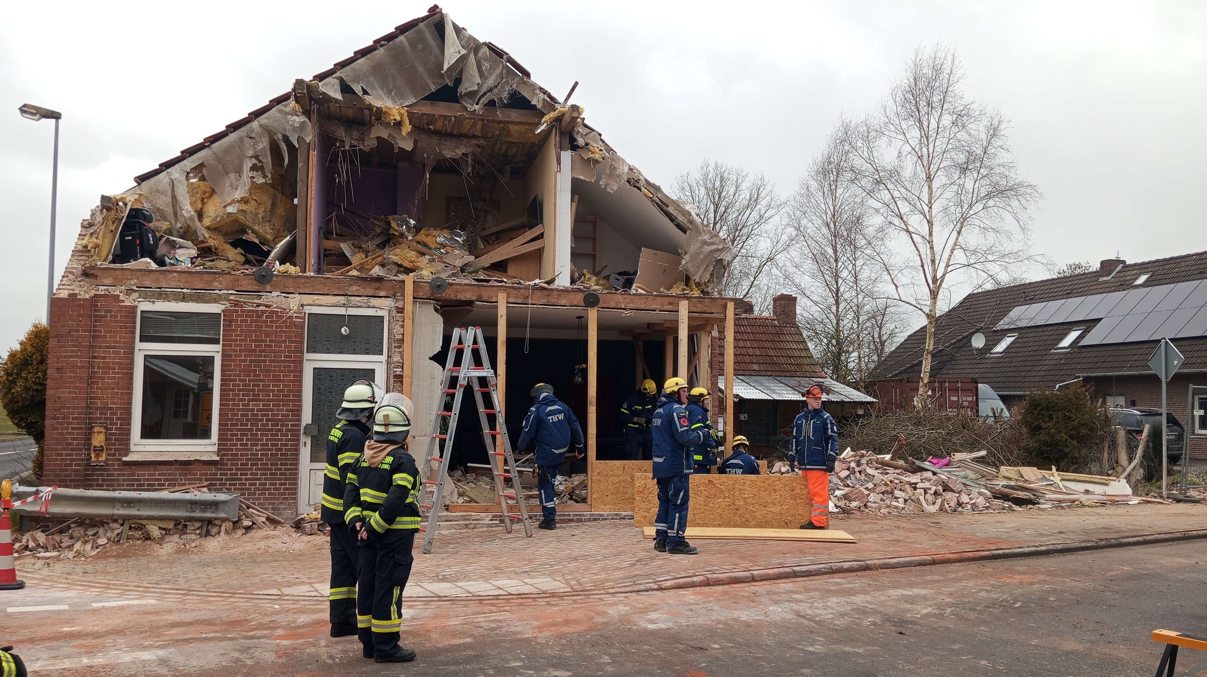 Bei der Begutachtung der Unfallstelle hatte sich herausgestellt, dass die Statik des betroffenen Wohnhauses massiv beeinträchtigt war, führte Rand aus. Im Giebelbereich hatten sich bereits Mauerteile und Fenster gelöst. Um eine unkontrollierte Gefährdung von Passanten und Fahrzeugen auf der Kirchstraße zu verhindern, traf ein Fachberater des Technischen Hilfswerks (THW) aus Meppen eine weitreichende Entscheidung: Nach Rücksprache und Genehmigung durch das Kreisordnungsamt wurde der instabile Bereich des Mauerwerks kontrolliert mit einem Bagger abgetragen.