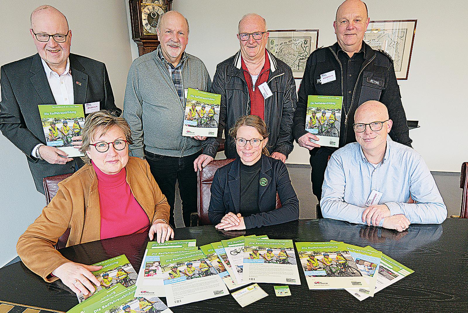 »Je früher unsere Kinder lernen, sich sicher im Straßenverkehr zu verhalten, desto besser«, sagen die Pressesprecherin der Brandkasse Signe Foetzki (vorne links), Schulleiterin Claudia Wilting und die Vertreter der ostfriesischen Verkehrswachten.  © Foto: Jürgens
