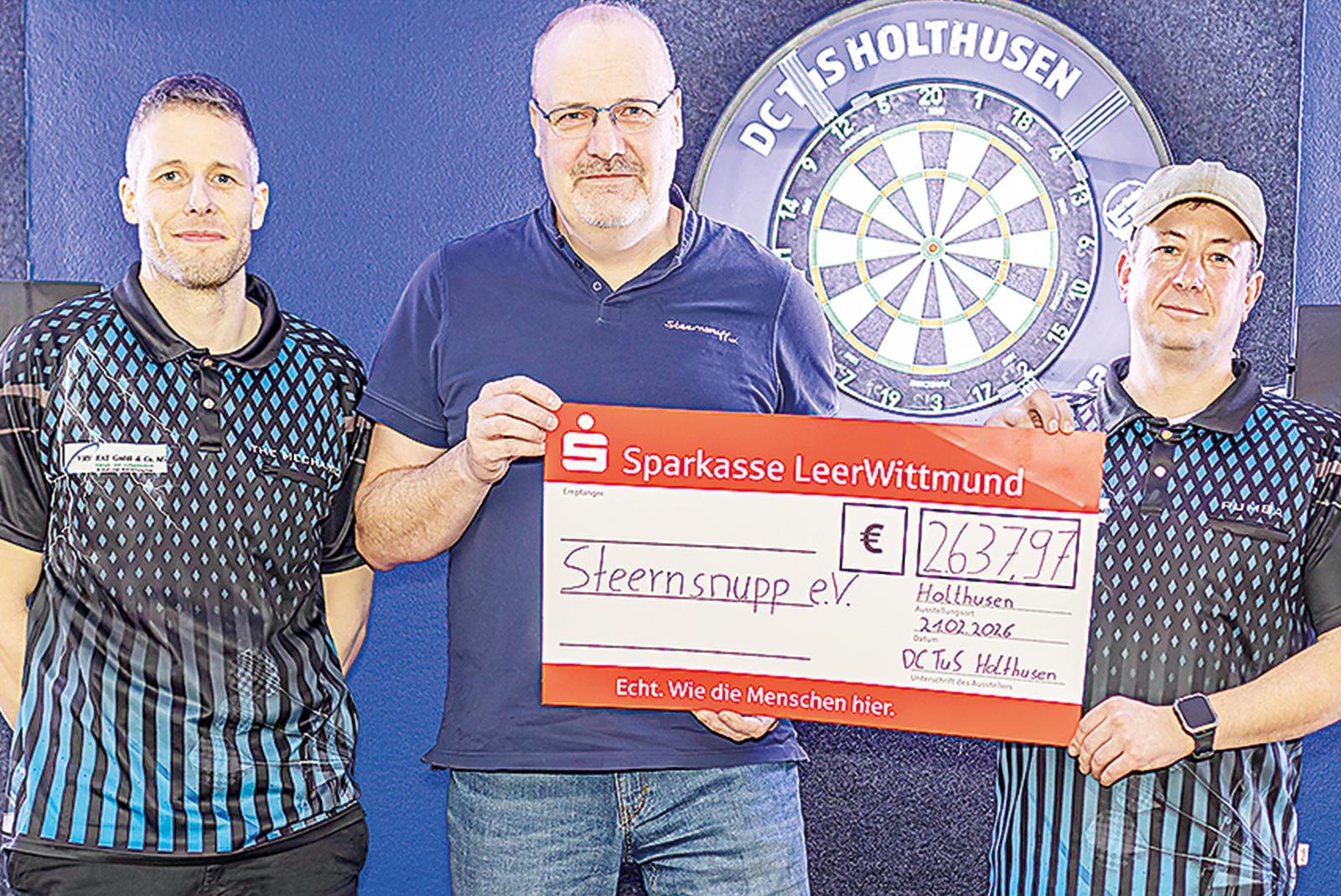 Mit einer Spendensumme von 2.637,97 Euro unterstützt der Dart-Club TuS Holthusen in diesem Jahr den Verein Steernsnupp. Die symbolische Übergabe erfolgte jetzt: Markus Gernand und Timo Schoormann vom DC TuS Holthusen überreichten die Spende an Heiner Kruse, Gründungsmitglied von ...