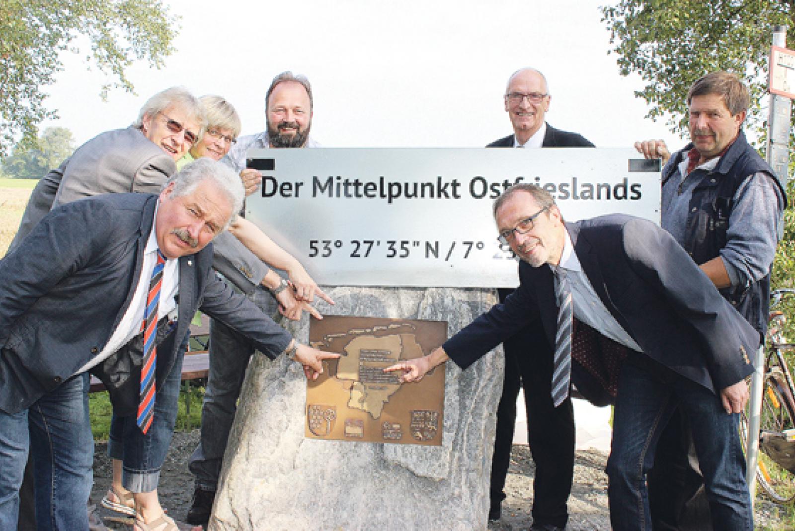 Norwegischer Granit markiert den exakten Mittelpunkt Ostfrieslands. Am Donnerstag wurde der Mittelpunkt, der in Westerende-Holzloog liegt, mit Bänken zum Verweilen von der Gemeinde Ihlow und der Ostfriesischen Landschaft offiziell vorgestellt.
